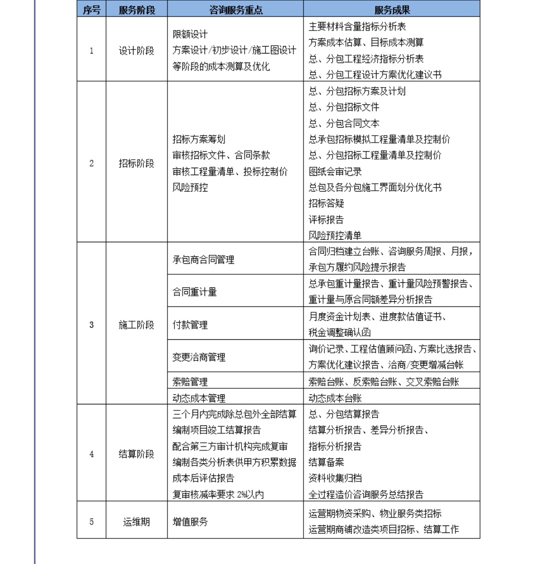 本項(xiàng)目為全過(guò)程造價(jià)咨詢,從項(xiàng)目方案設(shè)計(jì)階段介入直至項(xiàng)目交付使用結(jié)束,主要內(nèi)容涵蓋設(shè)計(jì)階段的成本測(cè)算、指標(biāo)分析及優(yōu)化建議等,招標(biāo)階段的圖紙會(huì)審、招標(biāo)文件及合同編制與審查、模擬清單編制及開(kāi)評(píng)標(biāo)組織等,施工階段的合同管理、工程價(jià)款支付、定價(jià)議價(jià)、工程變更控制、索賠管理及重計(jì)量工作等,結(jié)算階段的結(jié)算審核、編制審核報(bào)告、成本后評(píng)估等,具體內(nèi)容詳見(jiàn)下表。