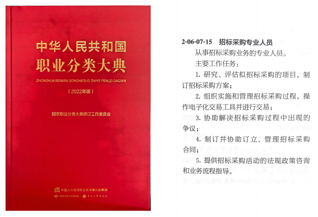 《中華人民共和國職業(yè)分類大典(2022年版)》正式對外發(fā)布。在國家發(fā)展改革委法規(guī)司全力支持下,中國招標(biāo)投標(biāo)協(xié)會(以下簡稱中招協(xié))組織市場主體、行業(yè)專家共同研究并多次赴人社部進(jìn)行匯報論證。招標(biāo)采購專業(yè)人員作為新增職業(yè)崗位正式納入《中華人民共和國職業(yè)分類大典(2022年版)》(以下簡稱《職業(yè)大典(2022年版)》)第二大類專業(yè)技術(shù)人員第6中類經(jīng)濟(jì)和金融專業(yè)人員第7小類商務(wù)專業(yè)人員第15細(xì)類,職業(yè)崗位編號(GBM2060715)。