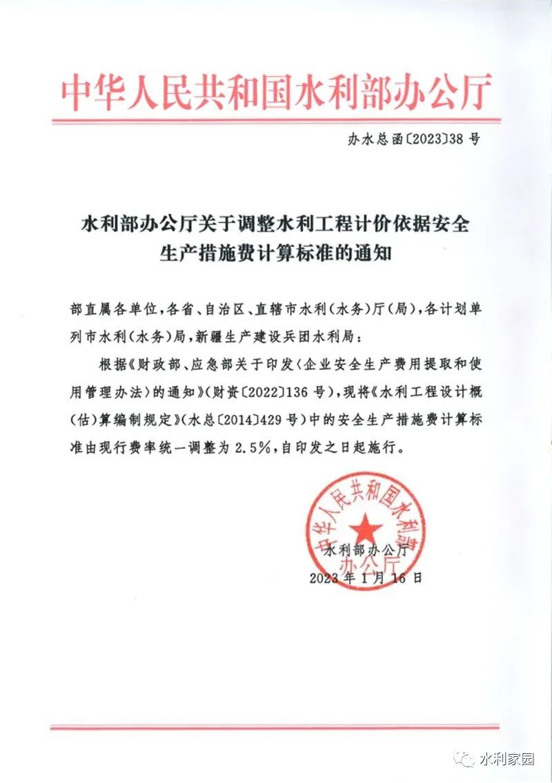 根據(jù)《財(cái)政部、應(yīng)急部關(guān)于印發(fā)〈企業(yè)安全生產(chǎn)費(fèi)用提取和使用管理辦法〉的通知》(財(cái)資〔2022〕136號(hào)),現(xiàn)將《水利工程設(shè)計(jì)概(估)算編制規(guī)定》(水總〔2014〕429號(hào))中的安全生產(chǎn)措施費(fèi)計(jì)算標(biāo)準(zhǔn)由現(xiàn)行費(fèi)率統(tǒng)一調(diào)整為2.5%,自印發(fā)之日起施行。