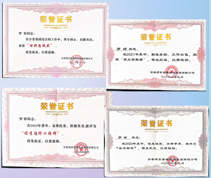 除了專業(yè)技能上的突出表現(xiàn),羅婷在公司任職期間還收獲了諸多榮譽。自進入公司后,她每年都榮獲企業(yè)頒發(fā)的個人優(yōu)秀證書。這些榮譽,是公司對她工作的高度認可,也是她辛勤付出的最好回報。每一張優(yōu)秀證書,都承載著她在過去一年里的努力與汗水,見證了她在工作崗位上的卓越貢獻。