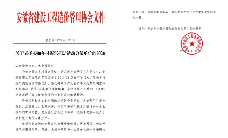 11月22日,安徽省建設(shè)工程造價(jià)管理協(xié)會(huì)(以下簡(jiǎn)稱協(xié)會(huì))下發(fā)了《關(guān)于表?yè)P(yáng)參加鄉(xiāng)村振興捐助活動(dòng)會(huì)員單位的通知》,集團(tuán)公司榮獲表?yè)P(yáng)。