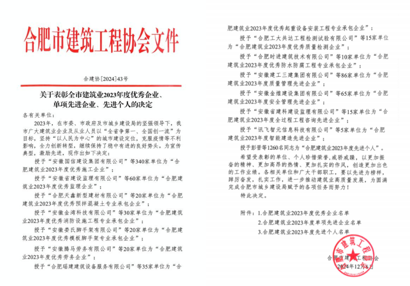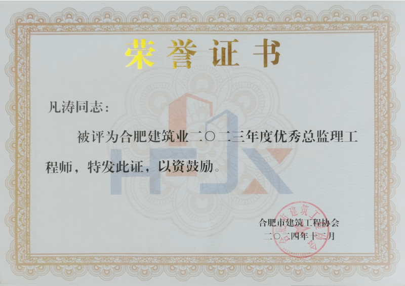 近日,合肥市建筑工程協(xié)會(huì)發(fā)布表彰文件,對(duì)全市建筑業(yè)2023年度優(yōu)秀企業(yè)、單項(xiàng)先進(jìn)企業(yè)及先進(jìn)個(gè)人進(jìn)行表彰。合普憑借穩(wěn)健的業(yè)務(wù)表現(xiàn)和良好的行業(yè)口碑,榮獲“合肥市建筑業(yè)2023年度優(yōu)秀監(jiān)理企業(yè)”稱號(hào)。同時(shí),集團(tuán)的汪志華、凡濤、陳志平三位員工,因在工作中展現(xiàn)出的專業(yè)素養(yǎng)與敬業(yè)精神,榮獲“合肥建筑業(yè) 2023 年度優(yōu)秀總監(jiān)理工程師”稱號(hào)。