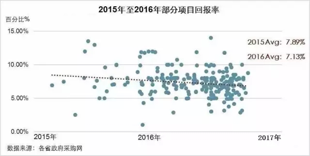 PPP融資成本要低至6%左右。2015年已中標(biāo)PPP項(xiàng)目回報(bào)率為7.89%,2016年至今已降至7.13%(見(jiàn)下圖)?紤]建設(shè)期資本金沒(méi)有回報(bào)及所得稅,PPP項(xiàng)目?jī)?nèi)部收益率可能降低至6%以下。因此PPP融資成本只有低于或者接近6%內(nèi)部收益率,才具有可行性。6%僅相當(dāng)于五年期貸款利率上浮約20%。只有銀行和保險(xiǎn)才能達(dá)到這么低的水平,其他資金成本就在8-10%以上,無(wú)法匹配。