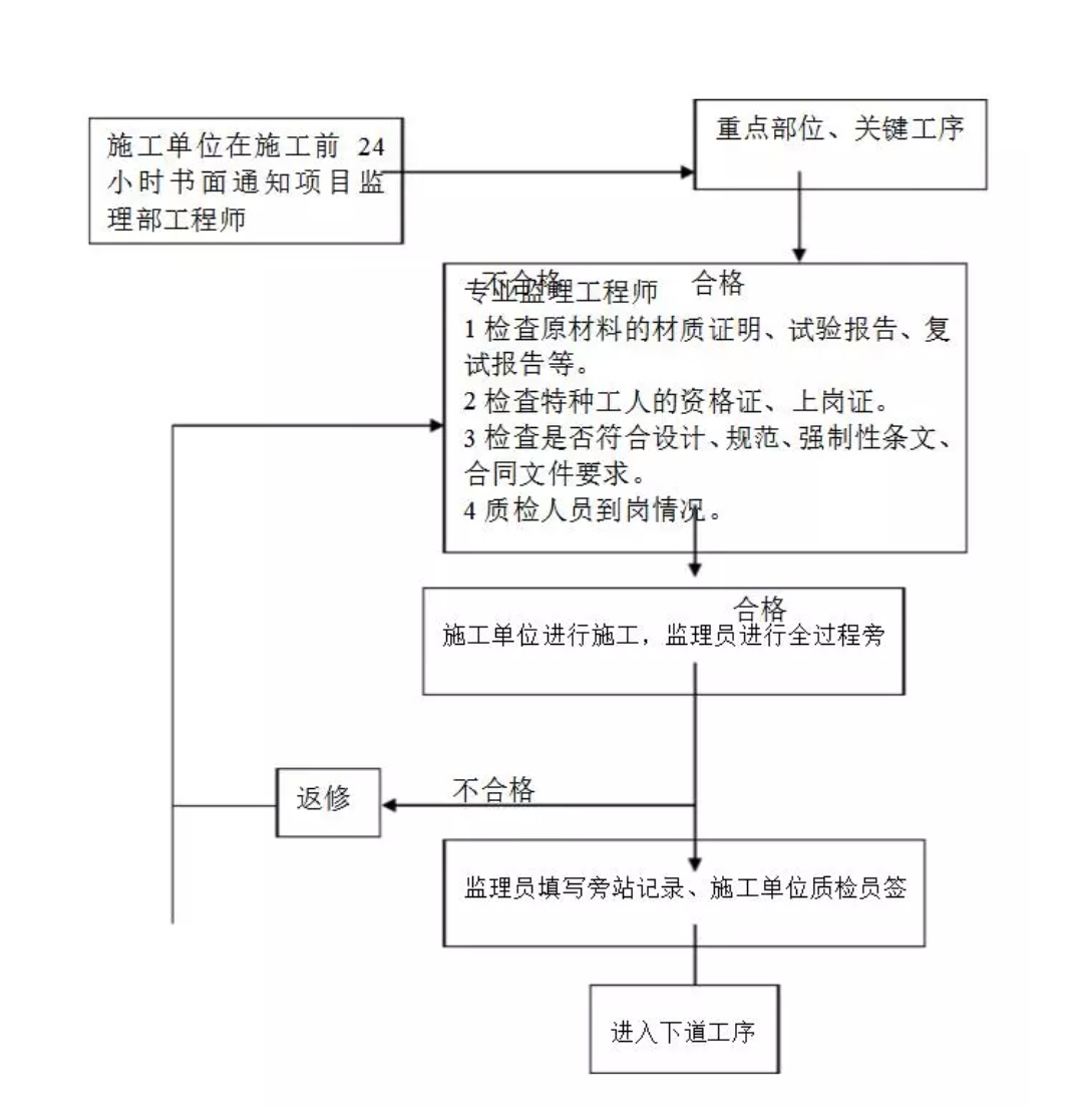 施工單位應在需旁站監(jiān)理的工序施工前24小時書面通知監(jiān)理部旁站監(jiān)理人員,并派技術或質(zhì)檢人員與監(jiān)理人員共同旁站監(jiān)督施工,并在施工完畢后簽字確認。